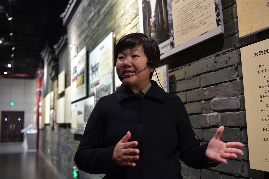 在中央紅軍長征出發(fā)紀(jì)念館,副館長鐘敏正在給參觀的游客介紹長征的歷史(4月6日攝)。新華社記者 彭昭之 攝