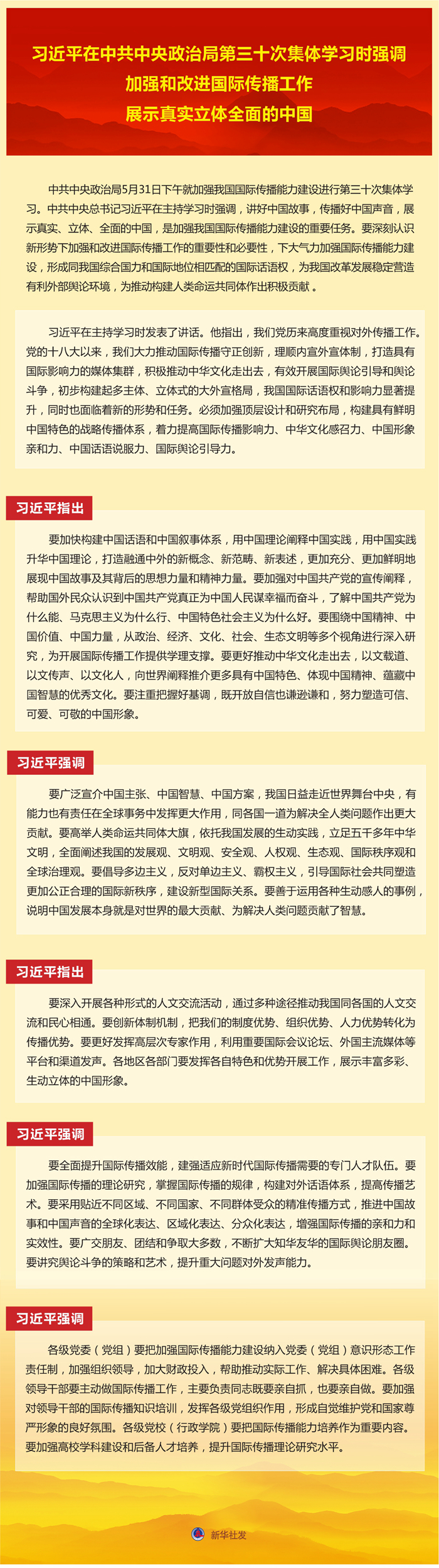 新華社北京6月1日電 中共中央政治局5月31日下午就加強(qiáng)我國(guó)國(guó)際傳播能力建設(shè)進(jìn)行第三十次集體學(xué)習(xí)。中共中央總書(shū)記習(xí)近平在主持學(xué)習(xí)時(shí)強(qiáng)調(diào),講好中國(guó)故事,傳播好中國(guó)聲音,展示真實(shí)、立體、全面的中國(guó),是加強(qiáng)我國(guó)國(guó)際傳播能力建設(shè)的重要任務(wù)。要深刻認(rèn)識(shí)新形勢(shì)下加強(qiáng)和改進(jìn)國(guó)際傳播工作的重要性和必要性,下大氣力加強(qiáng)國(guó)際傳播能力建設(shè),形成同我國(guó)綜合國(guó)力和國(guó)際地位相匹配的國(guó)際話語(yǔ)權(quán),為我國(guó)改革發(fā)展穩(wěn)定營(yíng)造有利外部輿論環(huán)境,為推動(dòng)構(gòu)建人類命運(yùn)共同體作出積極貢獻(xiàn)。