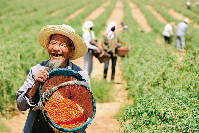 閩寧兩省區(qū)成功實現(xiàn)了援助式扶貧向開發(fā)式扶貧轉變。福建的人才、資金、技術、市場等要素與寧夏貧困地區(qū)的土地、特色農(nóng)產(chǎn)品和勞動力資源有機結合,帶動了當?shù)噩F(xiàn)代農(nóng)業(yè)和特色優(yōu)勢產(chǎn)業(yè)的發(fā)展。一個個特色優(yōu)勢產(chǎn)業(yè)集群正在改變著西海固落后的生產(chǎn)結構和傳統(tǒng)的生活方式。圖為寧夏同心縣農(nóng)民種植的枸杞喜獲豐收。  寧夏區(qū)委宣傳部供圖 李君杰/攝
