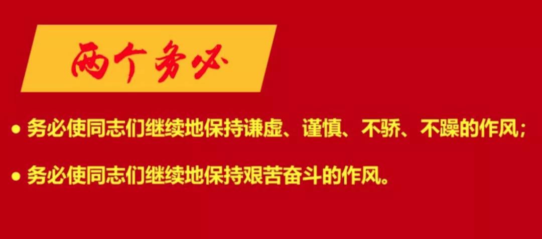 習(xí)近平總書記強(qiáng)調(diào):“對(duì)毛澤東同志提出‘兩個(gè)務(wù)必’的深邃思想和戰(zhàn)略考慮,我們要不斷學(xué)習(xí)領(lǐng)會(huì)。我們要不斷向全黨嚴(yán)肅鄭重地提出這個(gè)問題,始終做到謙虛謹(jǐn)慎、艱苦奮斗,使我們的黨永遠(yuǎn)不變質(zhì)、我們的紅色江山永不變色?!崩斡浭菫榱烁贸霭l(fā)。只有始終牢記全心全意為人民服務(wù)的宗旨,才能始終同人民風(fēng)雨同舟、領(lǐng)航中國(guó)號(hào)巨輪破浪前行;只有保持謙虛、謹(jǐn)慎、不驕、不躁的作風(fēng),只有保持艱苦奮斗的作風(fēng),才能始終同人民密切聯(lián)系在一起,在這場(chǎng)歷史性考試中經(jīng)受考驗(yàn),不斷向歷史、向人民交出新的更加優(yōu)異的答卷。