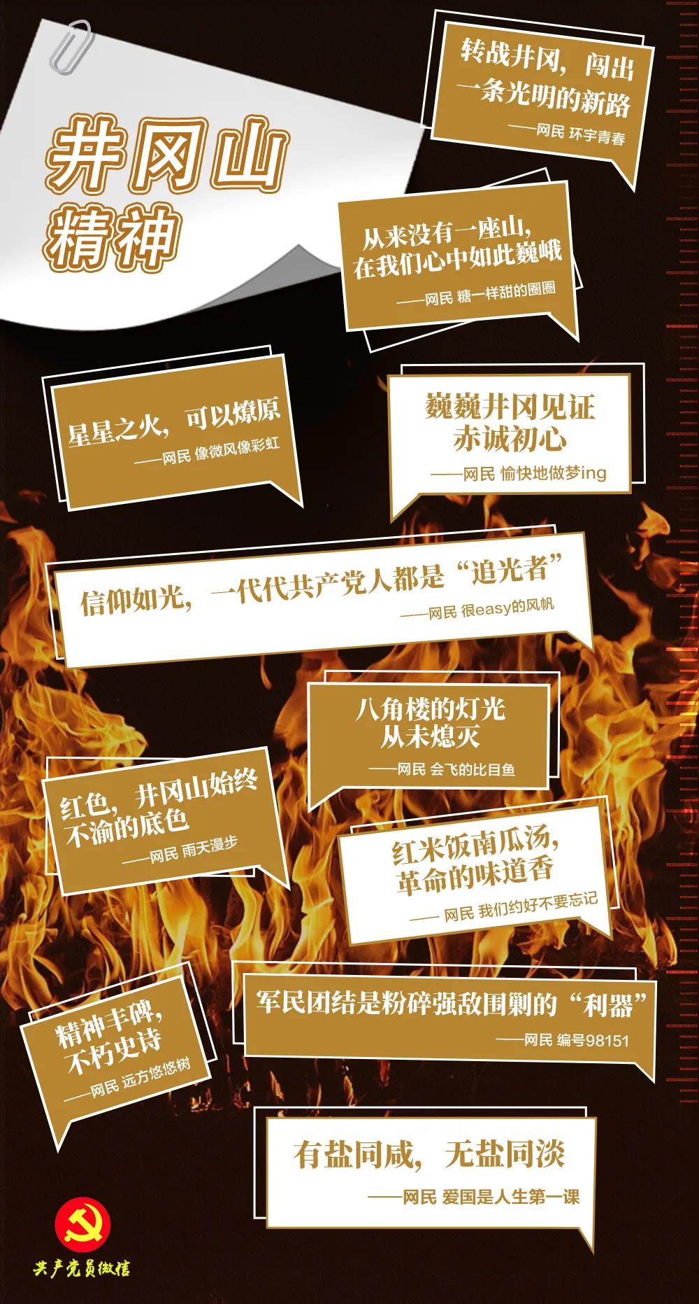 星星之火,終成燎原之勢(shì)。精神之光,燭照著中國革命一步步邁向成功,指引著中華民族偉大復(fù)興的新征程。挑糧的小道,八角樓的燈光,黃洋界的炮聲……撫今追昔,一個(gè)個(gè)銘刻在歷史上的印記,愈發(fā)熠熠生輝,震撼人心、砥礪前行。在社交平臺(tái)上,許多網(wǎng)民紀(jì)念那段崢嶸的井岡歲月,寫下對(duì)歷史的告白,堅(jiān)定對(duì)精神的傳承。
