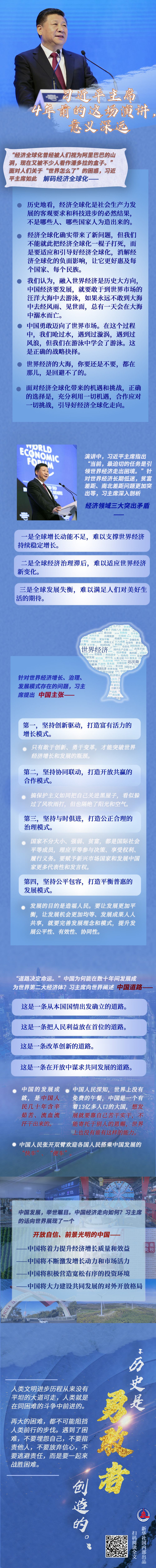 2017年1月,習(xí)近平主席在世界經(jīng)濟論壇2017年年會開幕式上發(fā)表題為《共擔時代責任 共促全球發(fā)展》的主旨演講,為處在十字路口的全球化進程指明方向,被論壇主席施瓦布贊譽“為我們帶來了陽光”,至今仍為世人津津樂道。
