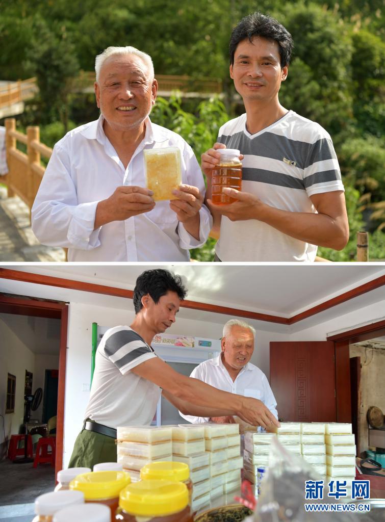 這是一張拼版照片,上圖為:井岡山神山村村民彭水生和兒子彭小華展示自家出品的蜂蜜(2020年7月15日攝);下圖為:神山村村民彭水生和兒子彭小華打包顧客訂購的蜂蜜(2020年7月15日攝)。新華社記者 彭昭之 攝