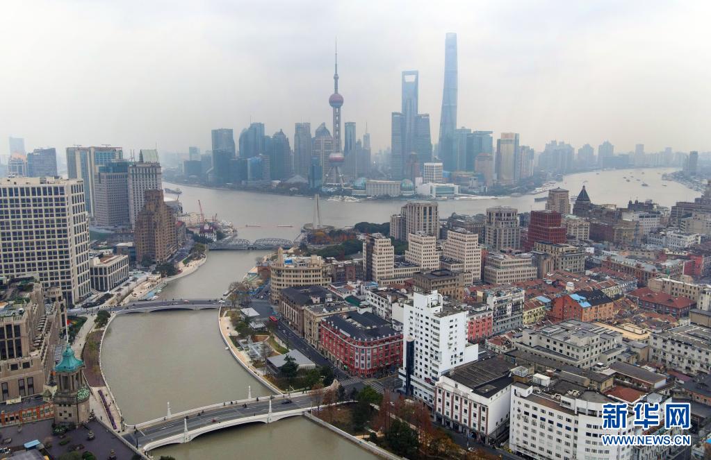 從空中俯瞰蘇州河(下)與黃浦江的交匯處(無人機照片,2020年12月29日攝)。新華社記者 方喆 攝