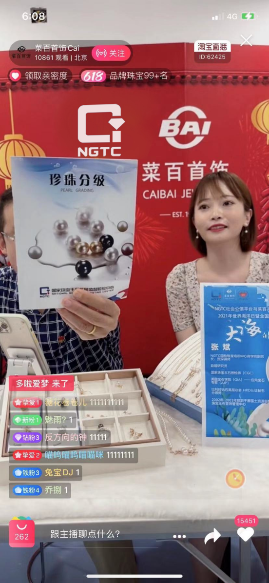 海洋日當(dāng)天珠寶國檢(NGTC)充分發(fā)揮自身科學(xué)檢測及教育培訓(xùn)的專業(yè)優(yōu)勢,由珠寶國檢(NGTC)教育專家——NGTC國檢珠寶培訓(xùn)中心商學(xué)院副院長、資深講師張斌與菜百首飾天貓旗艦店、淘寶店的專業(yè)主播一起,通過NGTC+直播間·一直播平臺,菜百首飾天貓旗艦店、菜百首飾淘寶直播間,礦業(yè)界微信公眾號聯(lián)合直播,為線上觀眾在線介紹珍珠的品質(zhì)分級原理及方法,解讀珠寶首飾的質(zhì)量保證——珠寶國檢(NGTC)證書,分享選購與保養(yǎng)等科學(xué)消費(fèi)知識。