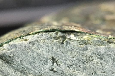 用長波紫外光照射樣品,皮殼部分呈現(xiàn)明顯的藍(lán)白色熒光而在皮殼脫落部分則無熒光(圖2)。將樣品切開觀察其縱切面發(fā)現(xiàn),皮殼與內(nèi)部玉肉之間有明顯邊界,而不是經(jīng)過風(fēng)化后皮殼與玉肉之間呈現(xiàn)的自然過渡狀態(tài),同時(shí)在內(nèi)部玉肉上發(fā)現(xiàn)部分綠色粉末。外皮殼實(shí)際由兩層組成:蠟質(zhì)外層和下面的綠色粉末層(圖3)。