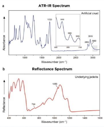 使用紅外光譜儀以衰減全反射率法(ATR)和漫反射法進(jìn)行測試,測試譜圖如圖4所示。如圖4a可知外層蠟皮殼在1500-2000cm-1范圍內(nèi)具有吸收帶,與蠟的特征相收相似,同時(shí)在2852、2919、2962、3035cm-1處出現(xiàn)與環(huán)氧樹脂有關(guān)的特征吸收。在皮殼脫落部位進(jìn)行漫反射測試,如圖4b所示在744和1050cm-1處有吸收峰,以及400-600 cm-1之間的四個(gè)譜帶,這與硬玉的特征吸收一致。這種人造皮殼可通過其低硬度,異常的紫外熒光和紅外光譜檢測等手段來進(jìn)行檢測區(qū)分。