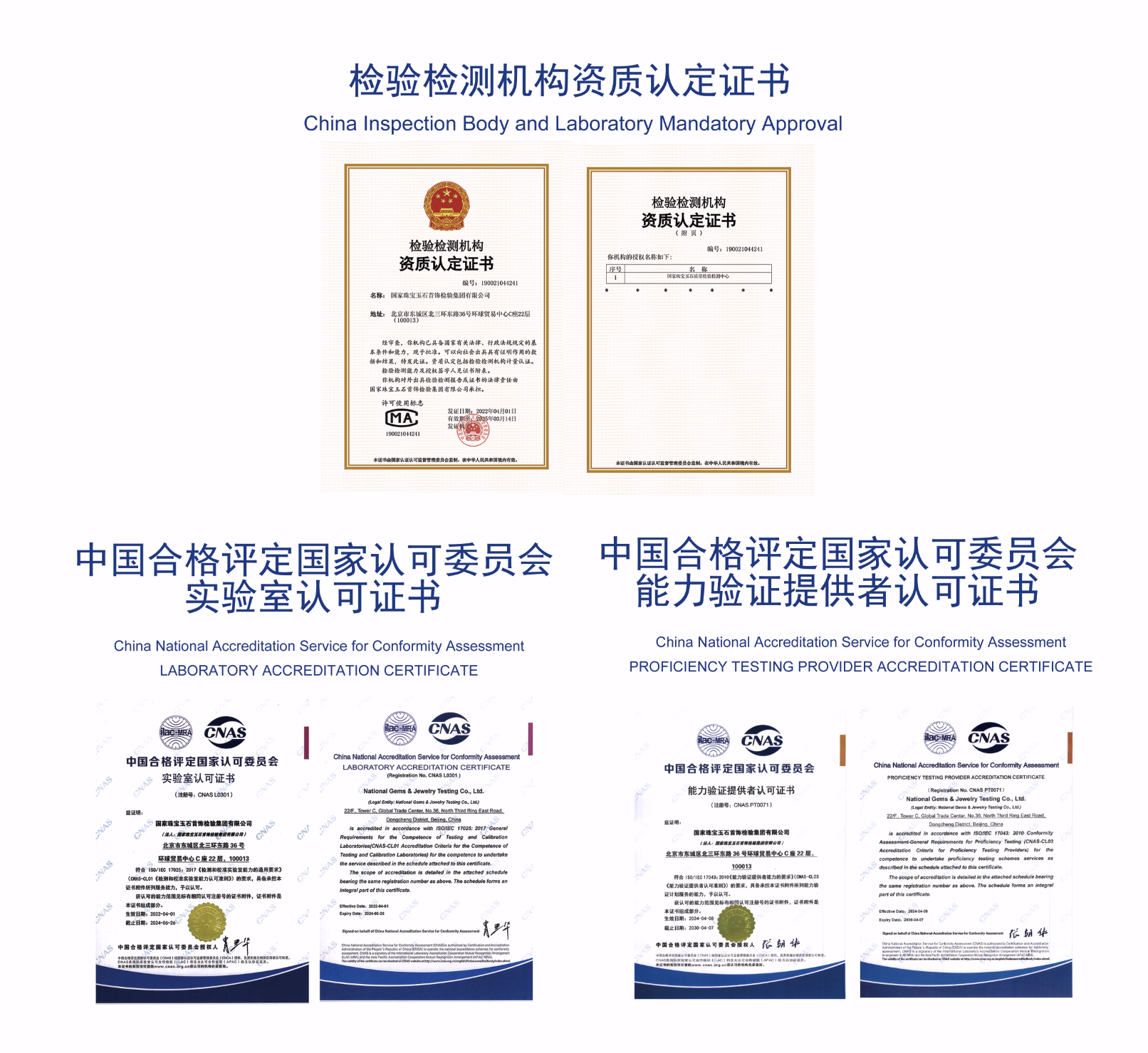 珠寶國檢是主管部門依法授權的珠寶玉石專業(yè)質檢機構。先后獲取檢驗檢測機構資質認定、中國合格評定國家認可委員會實驗室認可證書(CNAS L0301)以及中國合格評定國家認可委員會能力驗證提供者認可證書(CNAS PT0071)。
