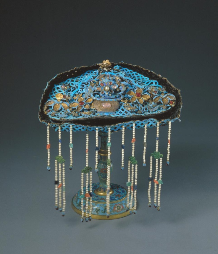 鈿又稱鈿子,是皇后、妃、嬪們平時戴的便帽。這種帽子一般用藤絲編成帽架,也有的在紙板或細(xì)鐵絲上纏繞黑色絲線為胎并編成方格紋、錢紋、盤腸等形式,再用各種寶石、珍珠嵌于帽架上,組成各種吉祥圖案。此鈿子用大珍珠50顆,二、三等珍珠幾百顆,寶石二百余塊,珠光寶氣,珍貴豪華,主要是在吉慶場合和傳統(tǒng)節(jié)日時戴用的。