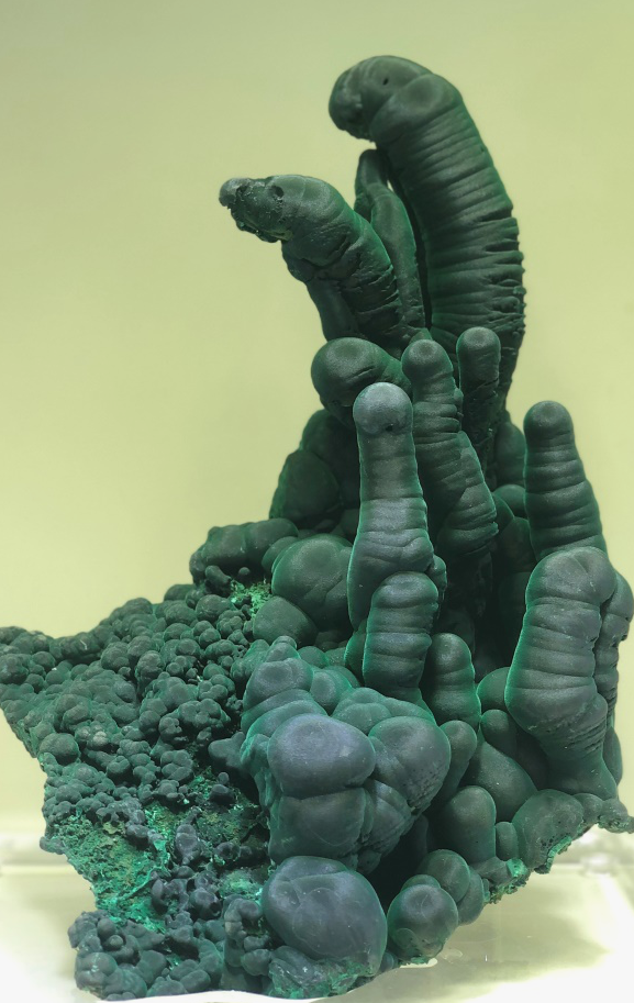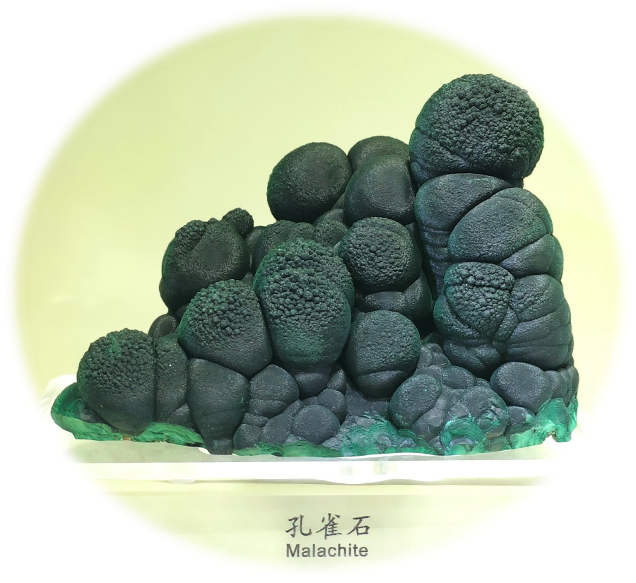 單體塊度較大的孔雀石以其各自獨(dú)特的姿態(tài),受到礦物晶體藏家喜愛,一般單體越大,價(jià)值越高,良石天成,稍加匠人雕琢,凸顯了天人合一的自然之美??兹甘瘑尉w多為細(xì)長的針狀、柱狀,集合體通常呈葡萄狀、鐘乳狀、放射狀、結(jié)核狀或同心環(huán)帶狀。我國的孔雀石主要產(chǎn)于廣東陽春、湖北大冶等地。廣東陽春產(chǎn)出的孔雀石形態(tài)多樣,鬼斧神工,奇妙至極;湖北大冶的孔雀石多為鐵銅氧化形成,質(zhì)地致密,色澤濃艷,獨(dú)具特色。在中國地質(zhì)博物館的展廳內(nèi),就展示了多件出自廣東陽春的精美孔雀石標(biāo)本。