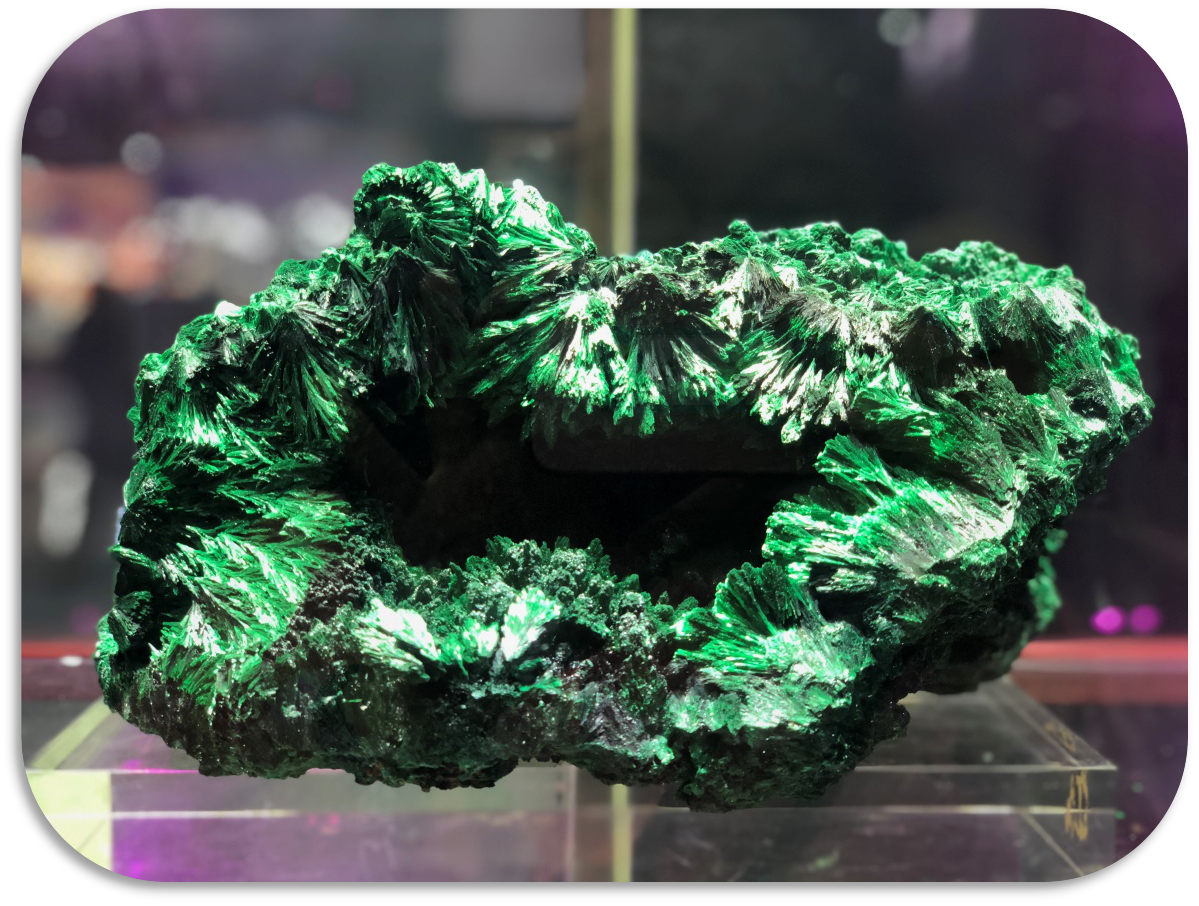 孔雀石形成美麗晶體或者集合體非常難得,雖然早已不作為煉銅的原料,但隨著大量銅礦資源被開發(fā)利用,很多孔雀石原礦也遭到了剝蝕、破壞。正因?yàn)樽鳛橛^賞石、寶玉石原料的孔雀石十分有限,愈發(fā)顯示出自然資源的珍貴,保護(hù)利用好大自然的饋贈(zèng),有序開發(fā)利用自然界的資源,才能保障人與自然的和諧共生、永續(xù)發(fā)展。