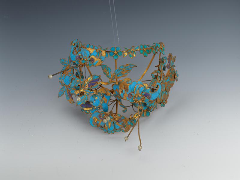 點翠鎏金“三多”銀頭花,清代,孔府舊藏。銀質(zhì)鎏金;點翠飾佛手、蝙蝠、瓞瓜、壽桃、花卉等紋。寓意多福、多壽、多子。點翠首飾種類繁多,有鈿子、頭面、釵、簪、耳墜、扁方、勒子等。點翠技法十分復雜,首先以金屬制成特定底托,再以金屬線勾勒圖案、紋樣,其上涂上適量的膠水粘貼翠鳥羽毛,形成精美圖案,色彩鮮艷,精美華麗,并常鑲嵌珍珠、碧璽、珊瑚、翡翠、瑪瑙等,更顯典雅高貴。