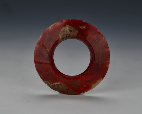 紅色,環(huán)形。內(nèi)厚外薄,外緣磨邊。紋理如流云繚繞,有白色瑕斑。
