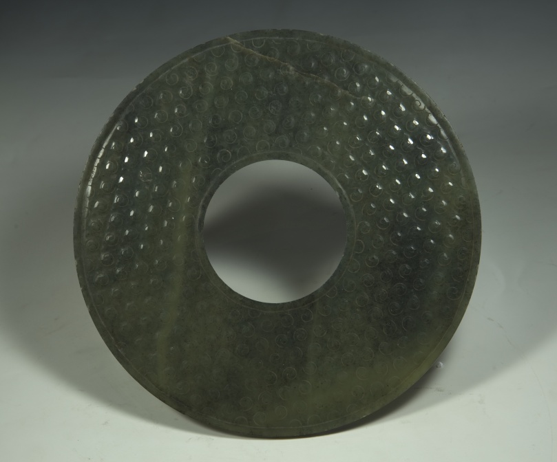 戰(zhàn)國(guó)·谷紋玉璧,直徑21.9厘米,厚0.7厘米。器扁平,圓形,晶瑩溫潤(rùn),兩面均飾淺浮雕谷紋。