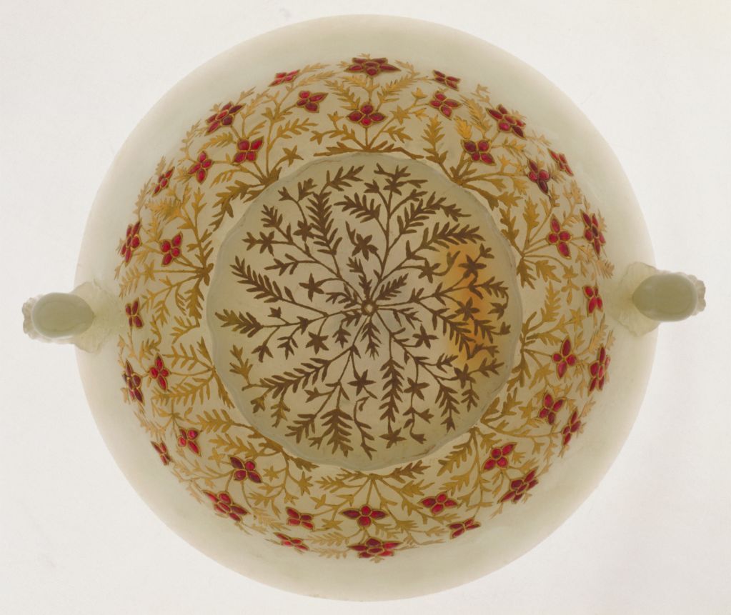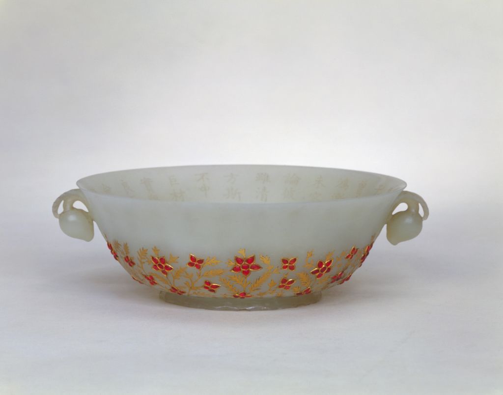藝術作品的風格與制作者的審美取向相關,在白如凝脂的玉上錯以黃金,鑲嵌紅色寶石,顯得格外豪華富麗。本器具有典型的痕都斯坦風格,通過器物外在的華美,體現(xiàn)出西部民族熱情奔放的性格特色。正因此碗具有獨特的藝術神韻且制作功力精湛,所以自乾隆五十一年(1786年)制成后始終為乾隆皇帝所珍愛,甚至在慶典活動時還被當作御殿賜茶的用具。