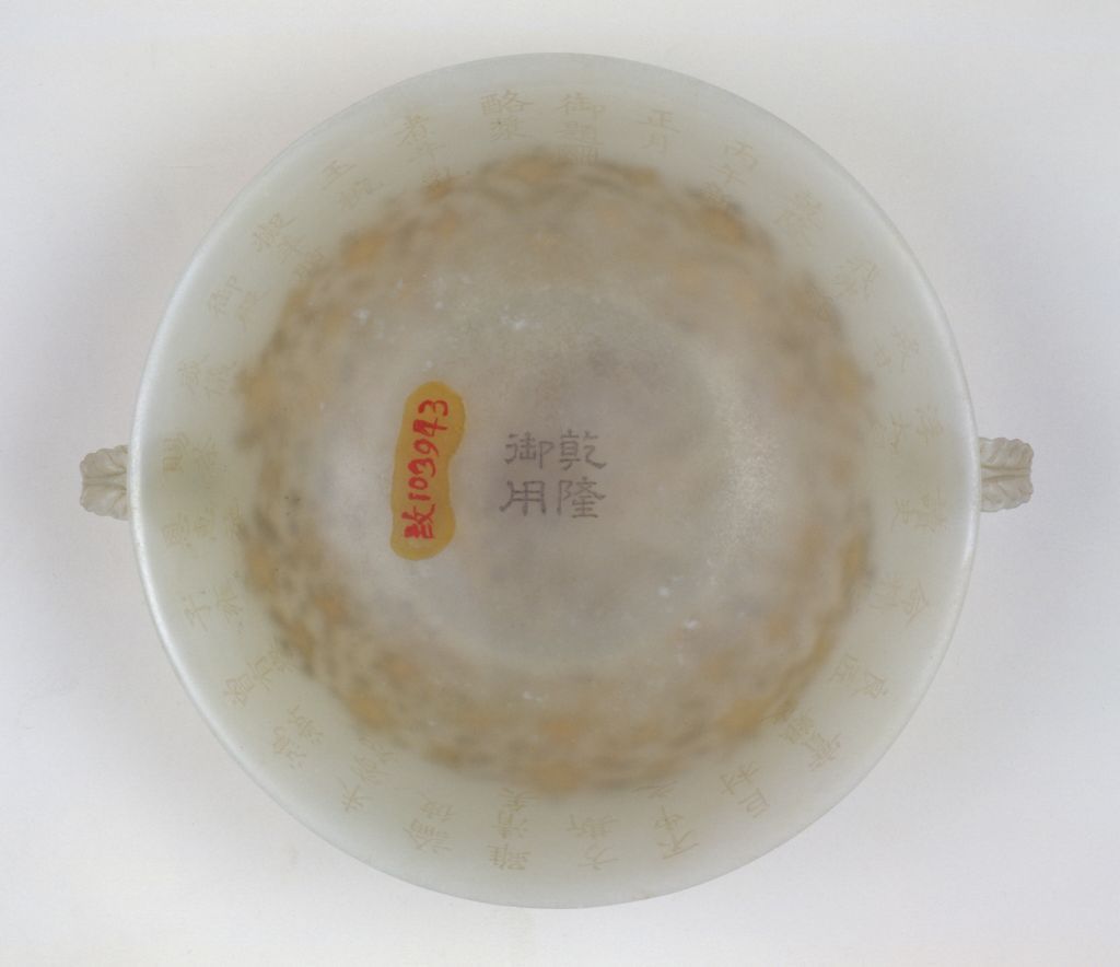 并有“乾隆丙午新正月”“御題”款識及“比德”印。碗內(nèi)底正中有隸書“乾隆御用”四字。