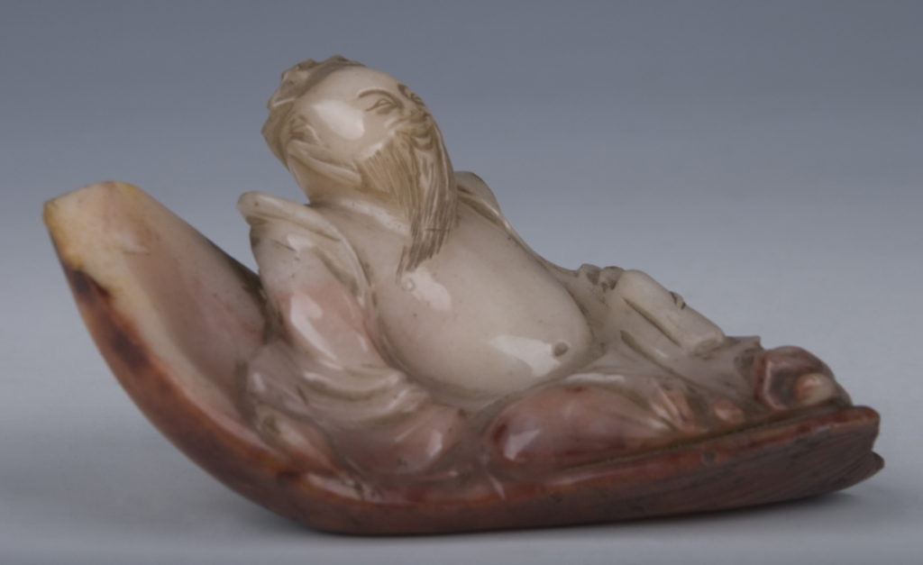 清乾隆瑪瑙人物,質(zhì)地為瑪瑙,保存完整,為瑪瑙巧雕。此雕刻為人物,雕一老漢,頭戴冠帽,面容慈祥,并帶微笑,長(zhǎng)須飄于胸前,袒胸大肚,外披衣衫,左手握一書卷,臥于一蕉葉形座椅上,悠然自得。蕉葉底部有十一道紋,人體部位白色,蕉葉部為紅色。整個(gè)作品雕刻精細(xì),技法嫻熟,人物栩栩如生,是一件品質(zhì)極高的精美藝術(shù)品,彰顯了中國工匠精神。此瑪瑙人物為清代的擺件,現(xiàn)存于山東汶上縣中都博物館,三級(jí)文物。