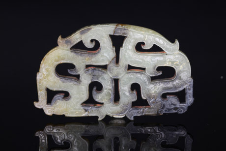 呈半圓形。透雕相背雙龍,體如“S”形彎曲,雙龍翅翼相連。龍身線刻勾云紋、網(wǎng)格紋、羽紋,兩面紋飾相同。有褐色瑕斑。