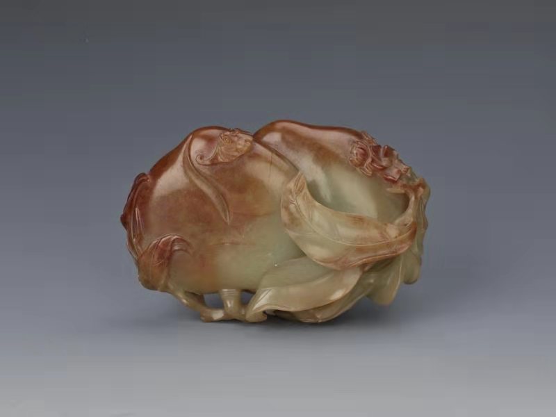 福壽青玉擺件,清代。透雕一桃樹枝干,上結雙桃,并蒂相依,桃面上又凸雕有一朵桃花和兩只蝙蝠。古之以桃為飾,多取王母蟠桃之壽意;以蝠為飾,則多取“蝠”音,二者相合,則為“福壽”之意,寓意多福多壽,吉慶和美。此擺件匠心獨具,巧用俏色、鏤雕等技法,琢刻生動逼真,渾然天成。