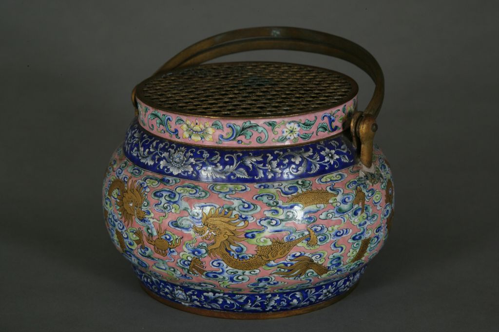 手爐圓形,上安設(shè)弧形提梁??谘貎?nèi)掛銅膽。蓋面以銅絲編結(jié)的密網(wǎng)做成,用以通風(fēng)換氣。器身中部以粉色為地,繪飾云龍戲珠紋,上下環(huán)以對(duì)稱(chēng)的藍(lán)地白花裝飾帶。