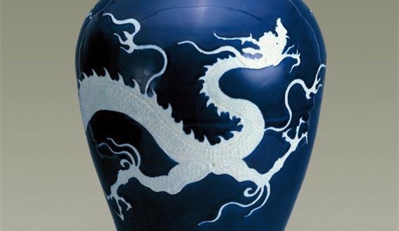 霽藍(lán)釉白龍紋梅瓶是元代瓷器制品的代表作,也是元代藍(lán)釉器中極為引人注目的藝術(shù)珍品。霽藍(lán)釉是化學(xué)元素鈷的呈色,最早見于唐三彩和唐白釉藍(lán)彩上,但這些都屬于低溫藍(lán)釉。元代,景德鎮(zhèn)的瓷工熟練地掌握了呈色劑制作方法,成功地?zé)瞥隽烁邷厮{(lán)釉。收藏于揚(yáng)州博物館的這件霽藍(lán)釉白龍紋梅瓶就是景德鎮(zhèn)窯高溫藍(lán)釉的杰出作品。