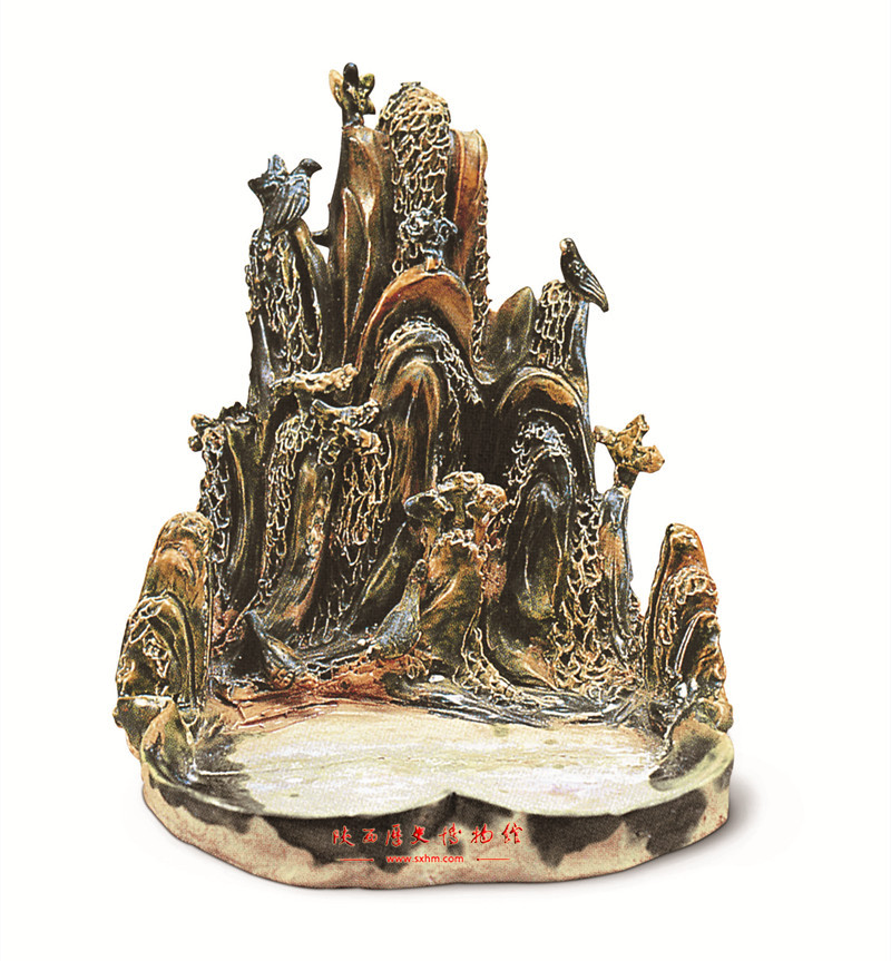 此三彩山池高18厘米,寬16厘米,是同墓出土的一組三彩住宅模型中的一件。該住宅象征著墓主生前豪華的宅第,為長(zhǎng)方形兩進(jìn)四合院,山池置于后院,應(yīng)為后院花園中的一座假山。山勢(shì)險(xiǎn)峻,層巒疊嶂,山間飄著云朵,山腰有數(shù)只鳥兒棲息,似雀躍歡唱。山腳與水池相連,池畔一雙鳥兒正引頸飲水。設(shè)計(jì)巧妙,山水相映,動(dòng)靜得趣。制作惟妙惟肖,如釉色上,山峰之翠綠、赭黃,鳥之藍(lán)綠,池畔之草綠,池水之純白,“雖由人設(shè),宛如天開”。整個(gè)作品充滿了蓬勃的生機(jī),再現(xiàn)了大自然的壯美景色,也從一個(gè)側(cè)面反映了唐代園林藝術(shù)的發(fā)展和進(jìn)步。
