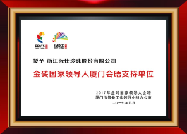 隨著中國高端珍珠走出中國,在國際社會(huì)的活躍度增加,2017年9月金磚國家領(lǐng)導(dǎo)人會(huì)晤,阮仕被授予“金磚國家領(lǐng)導(dǎo)人廈門會(huì)晤支持單位”“金磚國家領(lǐng)導(dǎo)人廈門會(huì)晤指定產(chǎn)品”榮譽(yù)。