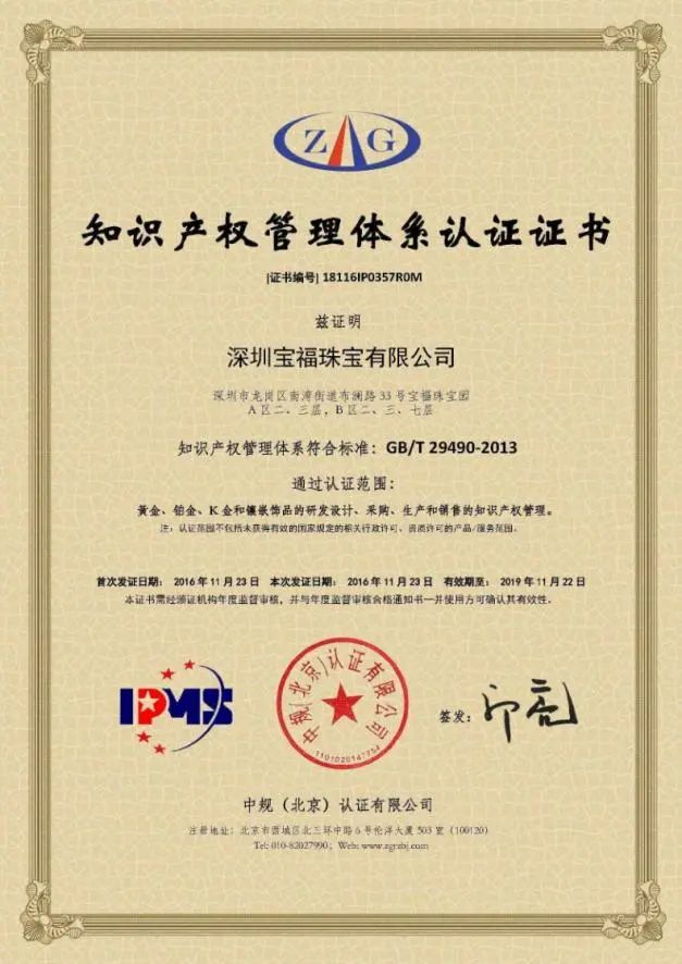 寶福十分注重知識產(chǎn)權(quán)體系的建設(shè),不斷提升創(chuàng)意設(shè)計水平,革新生產(chǎn)工藝,每年投入大量資金用于新產(chǎn)品設(shè)計研發(fā),以及國際化先進設(shè)備和人才引進,建立起知識產(chǎn)權(quán)管理體系。截至目前,寶福擁有注冊自主知識產(chǎn)權(quán)的24項發(fā)明專利、63項實用新型專利、160 多項產(chǎn)品外觀設(shè)計專利和31項著作權(quán)、160多個國內(nèi)商標(biāo),并于馬德里、歐盟成員國等城市和國家完成了國際商標(biāo)注冊。2016年,寶福成功通過“知識產(chǎn)權(quán)管理體系”認證,成為該領(lǐng)域認證成功的珠寶企業(yè)之一,奠定了品牌保護的重要基礎(chǔ)。由寶福全資建設(shè)的寶福李朗珠寶文化產(chǎn)業(yè)園多年來致力于園區(qū)知識產(chǎn)權(quán)體系構(gòu)建,于2017年榮獲深圳市知識產(chǎn)權(quán)局認證的“深圳市知識產(chǎn)權(quán)孵化基地”。