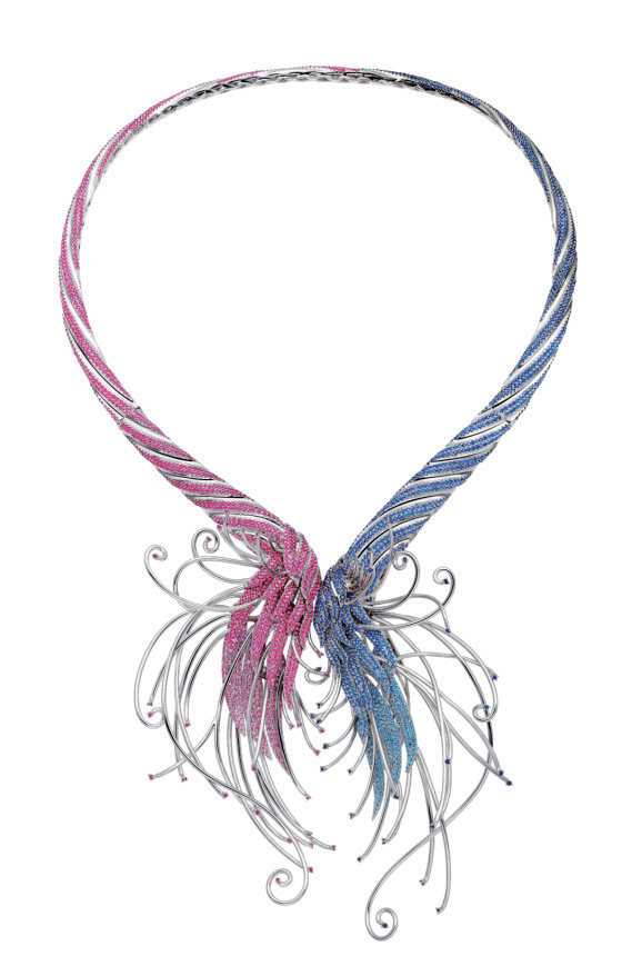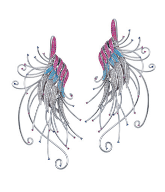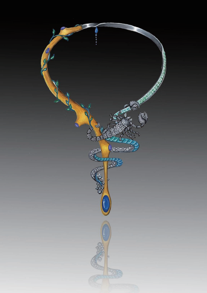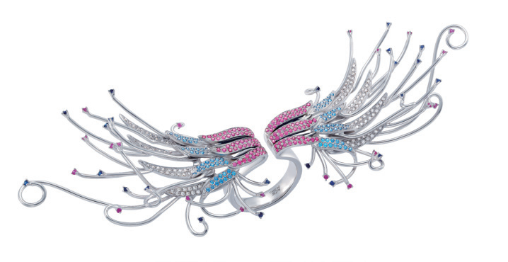 對(duì)比這一珠寶首飾造型形式要求首飾設(shè)計(jì)元素間要有明顯的差異性,例如虛與實(shí)、聚與散,大與小、銳利與圓潤(rùn)等,也可以包括位置與顏色的強(qiáng)烈差異。這些劇烈的變化,給人以鮮明醒目、跌宕起伏的視覺感受,從而加強(qiáng)作品的藝術(shù)表現(xiàn)力。
