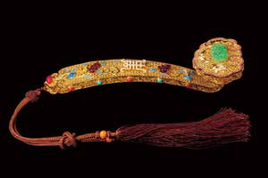 花絲鑲嵌玉石首飾著重表現(xiàn)中國式題材,以花絲為主,鑲嵌為輔。將細金工藝與螭虎、蟢子、蝙蝠等玉石或?qū)毷馁|(zhì)的吉祥形象結(jié)合,突出金鑲玉的含義,制造出金玉同輝的藝術(shù)效果。用金絲盤繞的雙線圖案、萬壽紋樣和蛛網(wǎng)形狀有著“鎮(zhèn)財”“福壽”“網(wǎng)喜”的寓意,是細膩金工與精致玉器的完美結(jié)合。