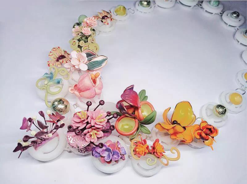 傳統(tǒng)珠寶首飾的色彩,主要由金屬本色和寶石色彩組成,局限性較大。而現(xiàn)代珠寶首飾,由于材料的不斷拓展和更新,色彩變得要加豐富和艷麗。作為與人互動(dòng)密切的產(chǎn)品,首飾的色彩可以影響顧客的購(gòu)買(mǎi)意向,所以在進(jìn)行首飾設(shè)計(jì)時(shí),要對(duì)色彩有深刻的理解和靈活的運(yùn)用。