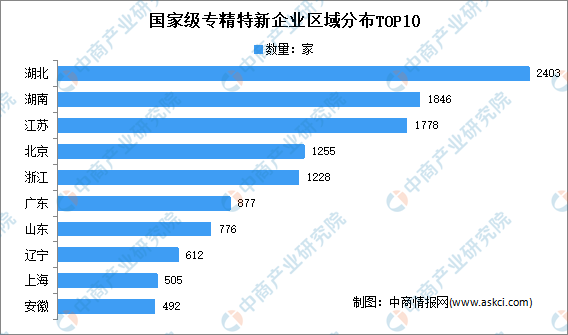 截至目前,國家級專精特新企業(yè)共計15351家,從省市來看,湖北省上榜企業(yè)數(shù)量位居第一,共計2403家;其次是湖南省,達1846家;再次是江蘇省1778家。前十省市共計上榜11772家,占總上榜企業(yè)數(shù)量的76.7%。前十省市分別為:湖北、湖南、江蘇、北京、浙江、廣東、山東、遼寧、上海、安徽。