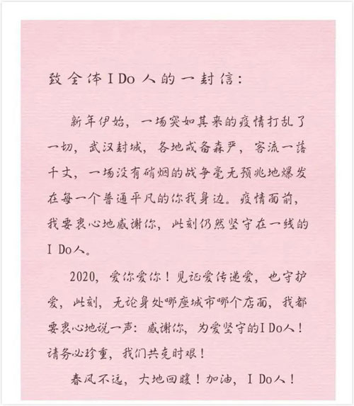 I Do各品牌門店均按照各地政府以及公司的統(tǒng)一部署,做好門店消毒以及一線員工的自我防護;各門店根據(jù)疫情發(fā)展采用“做一休一”的輪班制度,盡量減少同時在崗人員。