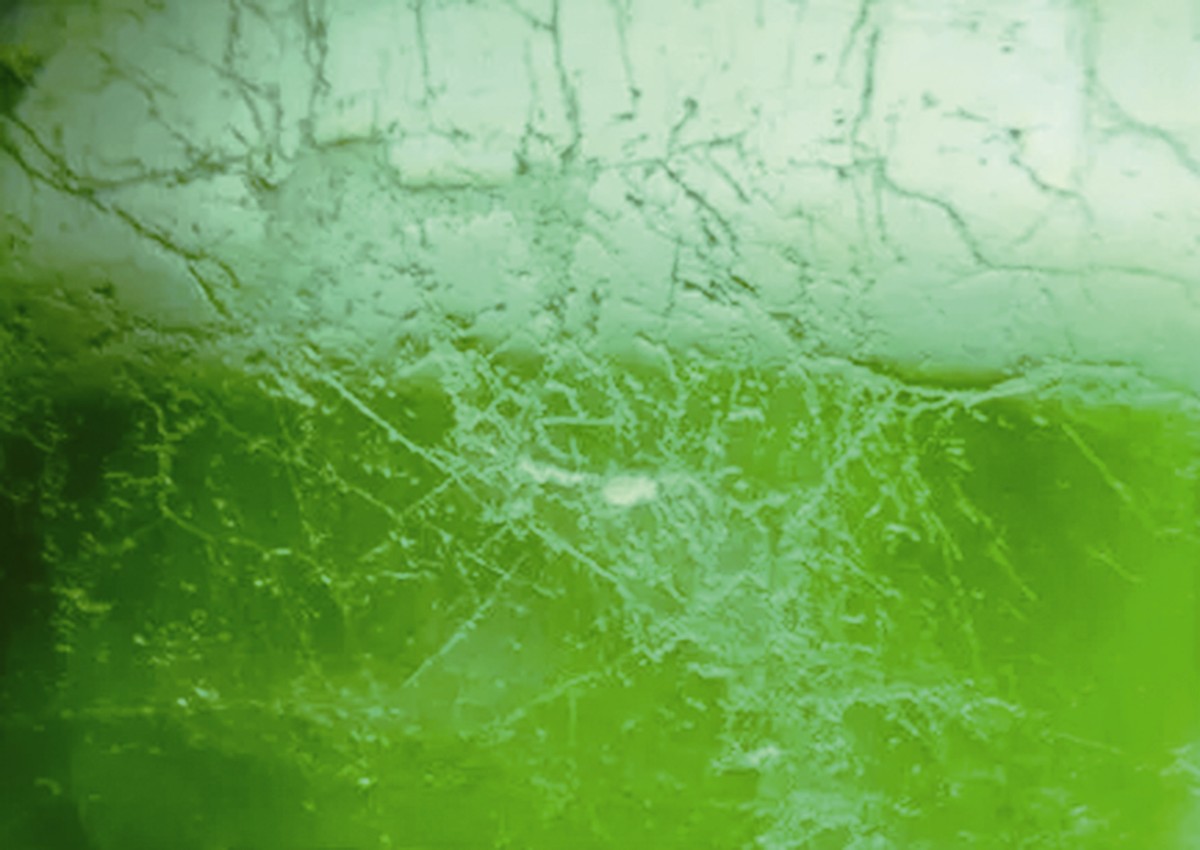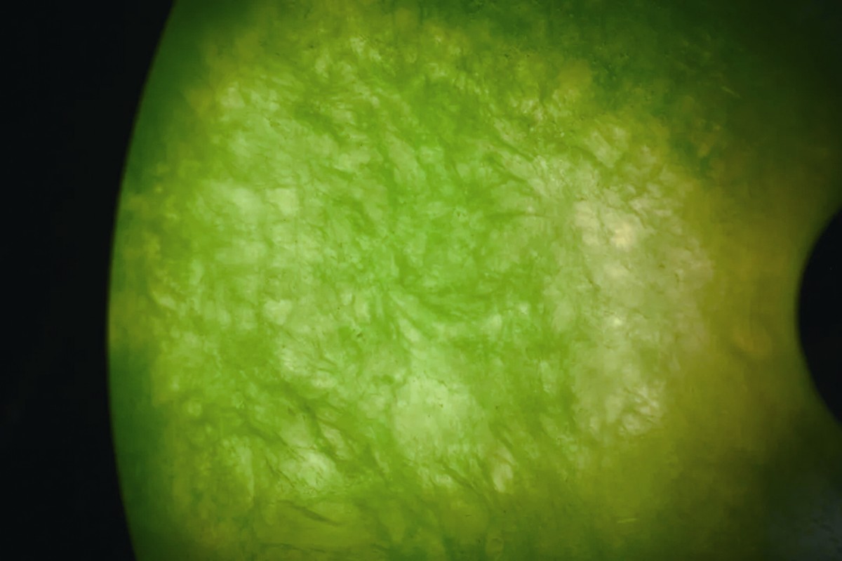 1.放大檢查:對于一件樣品首先需要做的就是肉眼觀察,觀察其表面和內(nèi)部特征。天然翡翠多為纖維交織結(jié)構(gòu),玻璃光澤。而經(jīng)過強酸強堿浸泡腐蝕后的翡翠,內(nèi)部結(jié)構(gòu)遭到破壞,疏松易碎,需使用樹脂等材料進行充填,呈現(xiàn)樹脂光澤或蠟狀光澤。充填物會掩蓋裂隙,但放大檢查仍可見表面蛛網(wǎng)狀酸蝕紋,拋光面可見顯微細裂紋,內(nèi)部結(jié)構(gòu)松散。