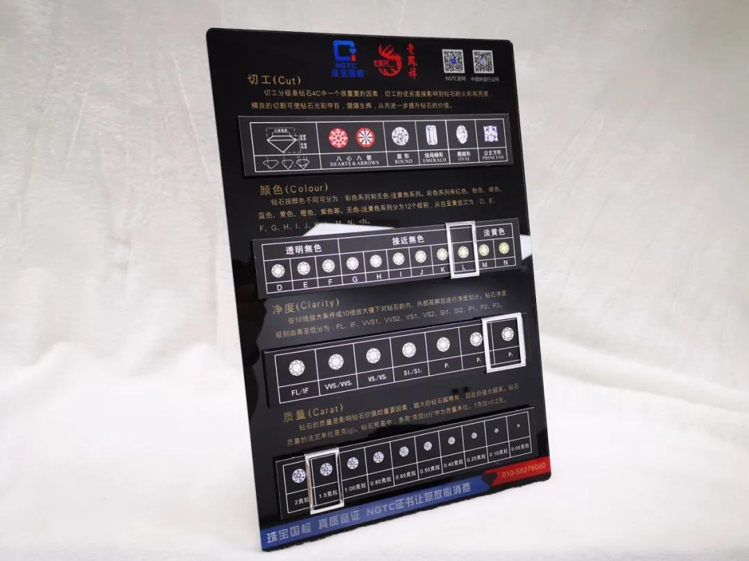 在“進市場、訪企業(yè)”專項行動中,珠寶國檢(NGTC)北京實驗室和老鳳祥雙方聯(lián)名制作了國家標準解讀鉆石4C展示牌,覆蓋老鳳祥京冀地區(qū)全部門店,為維護消費者的合法權(quán)益貢獻力量。