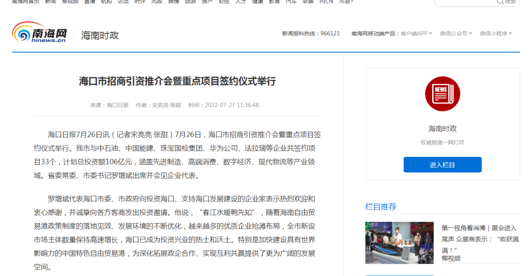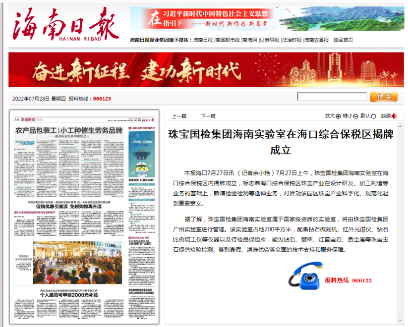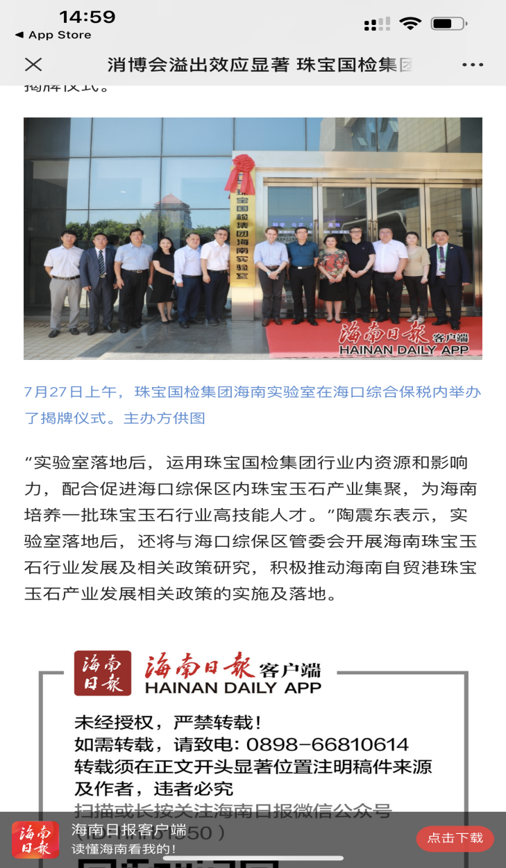 7月25日-30日,珠寶國(guó)檢集團(tuán)受邀參加第二屆中國(guó)國(guó)際消費(fèi)品博覽會(huì)(下簡(jiǎn)稱消博會(huì)),作為權(quán)威的國(guó)家級(jí)珠寶檢測(cè)機(jī)構(gòu),珠寶國(guó)檢集團(tuán)為消博會(huì)提供的綜合科技服務(wù)得到參展商、采購(gòu)商、消費(fèi)者的一致好評(píng);在消博會(huì)期間,珠寶國(guó)檢集團(tuán)受邀出席海口市招商引資推介會(huì)暨重點(diǎn)項(xiàng)目簽約儀式,珠寶國(guó)檢集團(tuán)海南實(shí)驗(yàn)室正式揭牌,以科技服務(wù)海南自貿(mào)港珠寶玉石產(chǎn)業(yè)發(fā)展。以上系列服務(wù)與舉措獲得海南電視臺(tái)新聞?lì)l道、海南日?qǐng)?bào)、海南日?qǐng)?bào)客戶端、??谌?qǐng)?bào)等媒體的關(guān)注與報(bào)道。