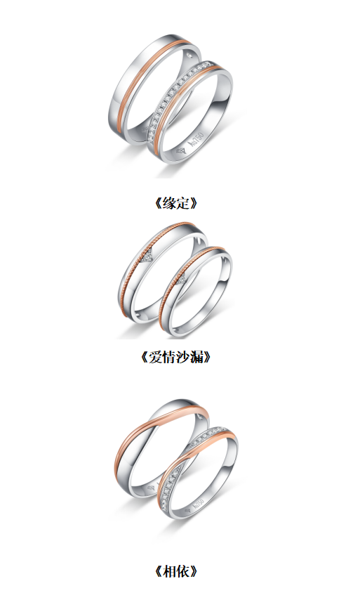 “一線牽”系列以鉆石對戒為主,共38件單品,主打款為“緣定”、“相依”、“愛情沙漏”,設(shè)計(jì)靈感來源于中國古代象征姻緣美滿的“月老紅線”,在“千里姻緣一線牽”的傳統(tǒng)文化基礎(chǔ)上,以“金絲扭繩”和“光金紅線”來詮釋“線”的概念,一條紅線把兩顆心牽引在一起,傳遞愛的誓言,抒寫綿長愛意。