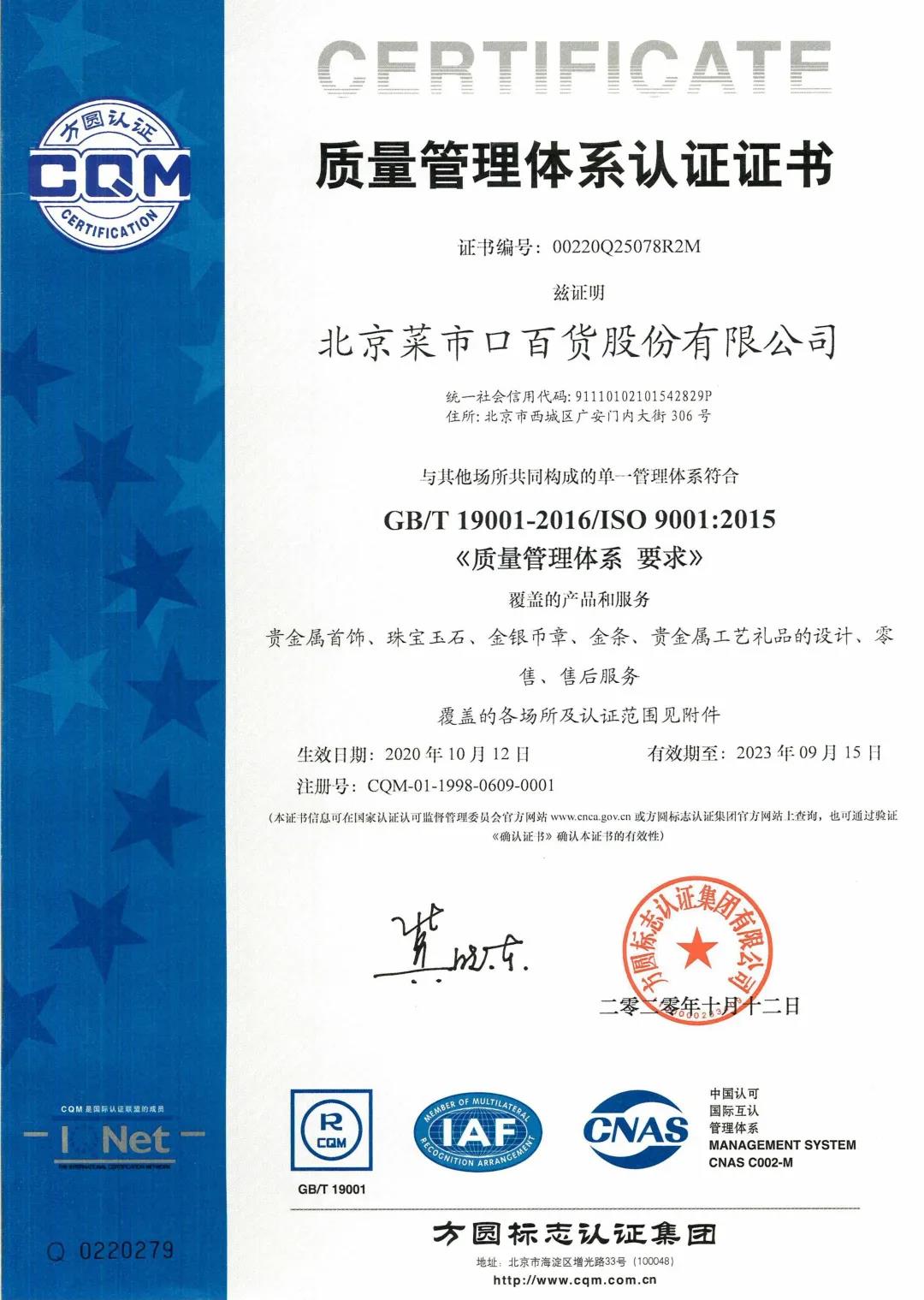 菜百股份質(zhì)量管理體系認(rèn)證證書。
