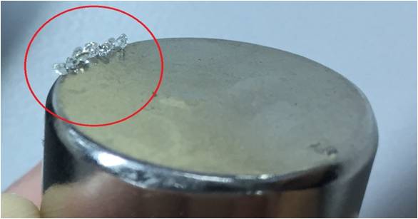 圖片中顯示高溫高壓合成的鉆石內部含有鐵磁性包裹體,可以被磁鐵吸附