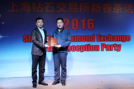 國家珠寶玉石質(zhì)量監(jiān)督檢驗中心上海實驗室主任馬永旺接受鉆交所副總裁顏南海先生頒發(fā)的2015年度貢獻(xiàn)獎