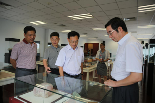 寶石中心葉志斌主任(右一)、梁振杰副主任(左二)、畢立君同志(右二)在國(guó)檢珠寶培訓(xùn)中心楊立信主任(左一)的陪同下參觀礦石標(biāo)本展廳