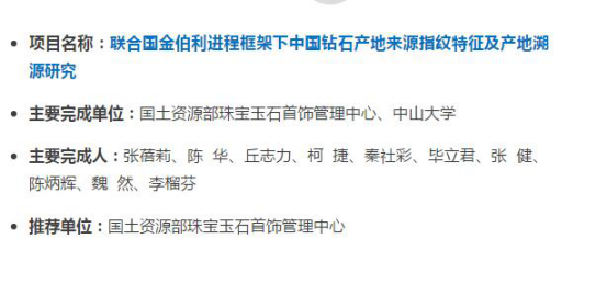 1018日,國土資源部發(fā)布2016年第24號公告,國土資源部珠寶玉石首飾管理中心(NGTC)和中山大學(xué)的合作項目“聯(lián)合國金伯利進程框架下中國鉆石產(chǎn)地來源指紋特征及產(chǎn)地溯源研究”喜獲國土資源科學(xué)技術(shù)獎二等獎!
