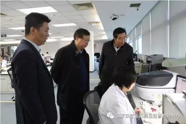 國土資源部黨組成員、副部長王廣華(中)在寶石中心黨委書記、主任葉志斌(右一),北京實驗室主任周軍(左一)的陪同下視察北京實驗室