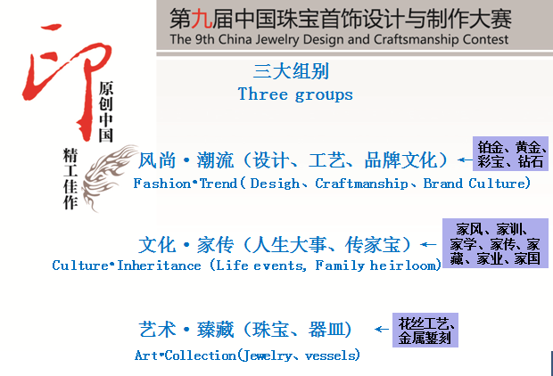 第九屆中國珠寶首飾設(shè)計(jì)與制作大賽以《白皮書》消費(fèi)理論數(shù)據(jù)為指導(dǎo),根據(jù)中國珠寶文化消費(fèi)品的大眾文化消費(fèi)、個性化定制消費(fèi)、投資收藏消費(fèi)人群的升級需求,進(jìn)行時尚珠寶、文化珠寶和藝術(shù)珠寶的供應(yīng)鏈升級。設(shè)立“風(fēng)尚·潮流”、“文化·家傳”、“藝術(shù)·臻藏”三大組別。