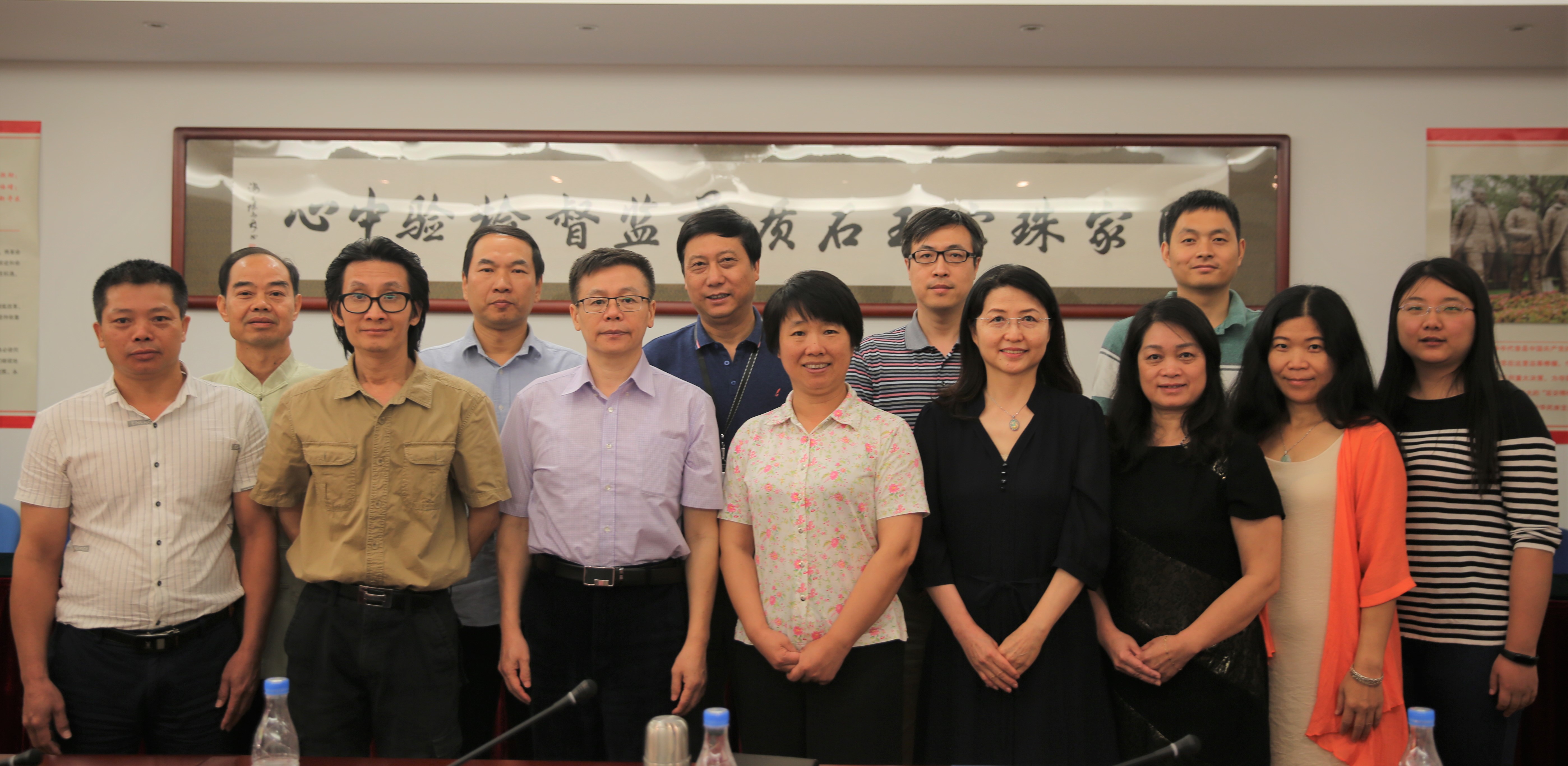 國土資源部珠寶玉石首飾管理中心(國家珠寶玉石質(zhì)量監(jiān)督檢驗(yàn)中心NGTC)副主任柯捷(前排左四)、中心各處室負(fù)責(zé)人與梧州學(xué)院黨委書記唐耀華(前排左三)、梧州寶石職業(yè)培訓(xùn)學(xué)校校長覃斌榮(前排左一)、梧州學(xué)院寶石與藝術(shù)設(shè)計學(xué)院院長楊杰(前排左二)、科研處處長陳劍(前排右三)等一行合影