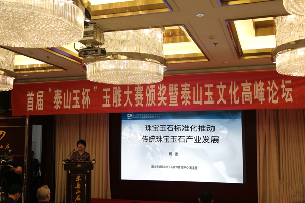 2017年9月6日下午,國土資源部珠寶玉石首飾管理中心(國家珠寶玉石質(zhì)量監(jiān)督檢驗中心 NGTC)柯捷副主任受邀出席了于山東省泰安市舉辦的首屆“泰山玉杯”玉雕大賽頒獎暨泰山玉文化高峰論壇,并在論壇上做了《珠寶玉石標(biāo)準(zhǔn)化推動傳統(tǒng)珠寶玉石產(chǎn)業(yè)發(fā)展》的主題發(fā)言。