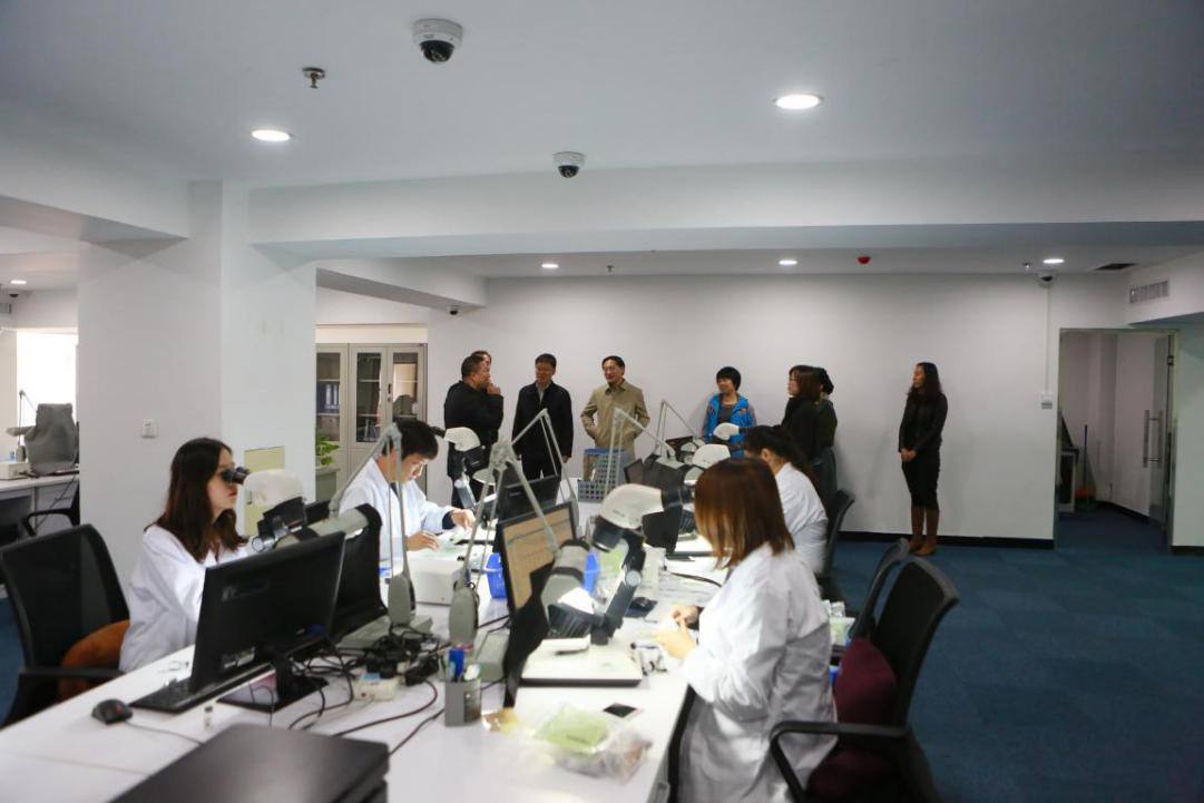 2017年10月19日上午,國家珠寶玉石質量監(jiān)督檢驗中心(NGTC)副主任梁振杰、柯捷、張曉、畢立君等一行10余人赴NGTC沈陽實驗室及遼寧中金歐亞珠寶集團所屬中國黃金北方國際珠寶城調研。