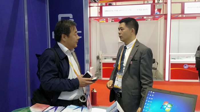 中國歐洲經(jīng)濟(jì)技術(shù)合作協(xié)會上海辦事處執(zhí)行主任汪赟與NGTC上海實(shí)驗(yàn)室主任王新民在NGTC展位交流