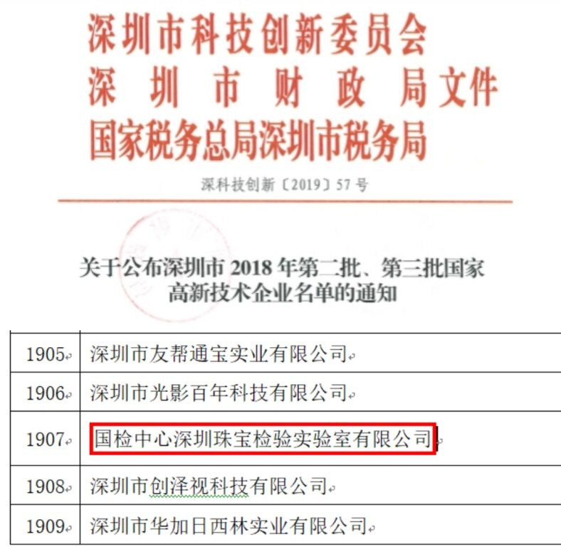近日,深圳市科技創(chuàng)新委員會下發(fā)了《關(guān)于公布深圳市2018年第二、三批國家高新技術(shù)企業(yè)名單的通知》(深科技創(chuàng)新〔2019〕57號),國家珠寶玉石質(zhì)量監(jiān)督檢驗中心(NGTC)深圳實驗室被認定為2018年第二批國家高新技術(shù)企業(yè),并收到了“高新技術(shù)企業(yè)”證書。