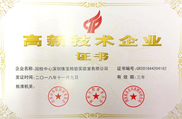 【喜報】國家珠寶玉石質(zhì)量監(jiān)督檢驗中心(NGTC)深圳實驗室榮獲“國家高新技術(shù)企業(yè)”稱號